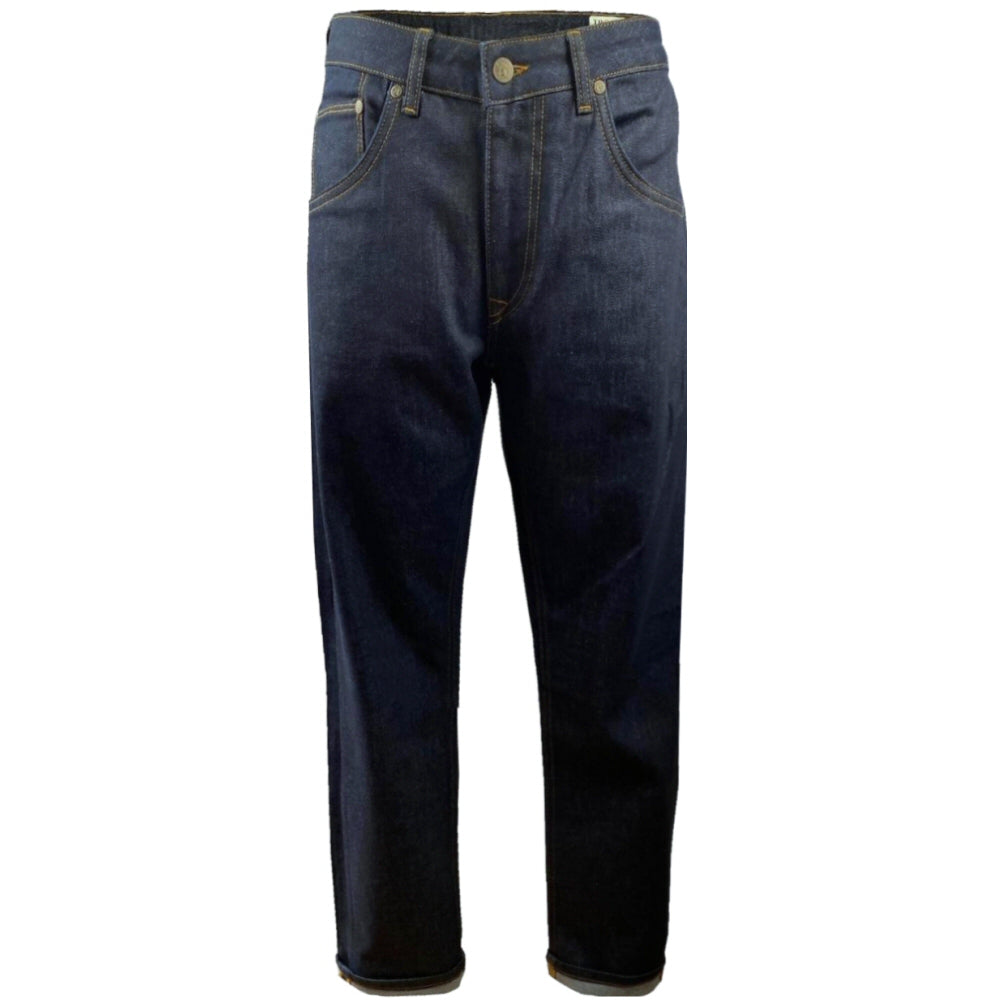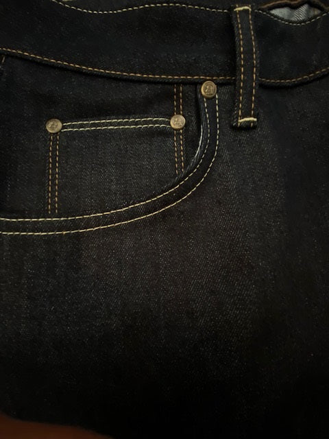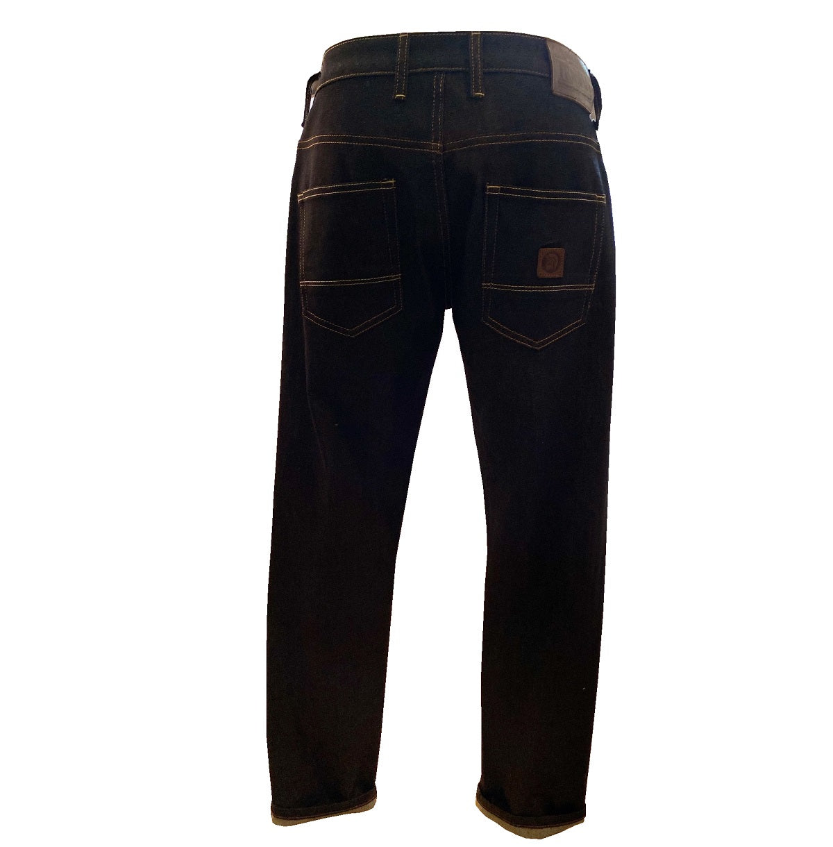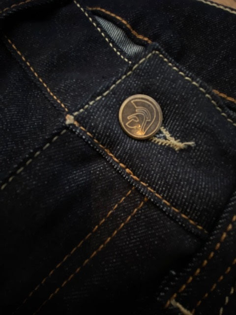 Zip fly jean in durable stretch denim. Straight Leg (14.5″ hem on 32W). Zip fly. 5 pocket style denim jean with coin pocket. Traditional gold stitching throughout, including stitch detail to hem turn-up. Front pockets with Trojan branded rivets, matching top button. Leather Trojan patch on waistband with hand stitched metal badge detail to pocket.