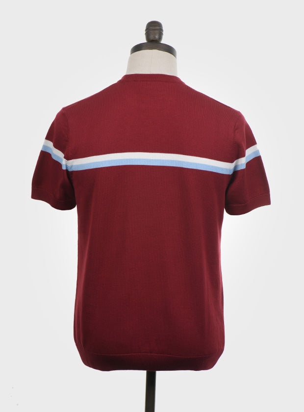 Wine, short sleeved, knitted t shirt with off white & sky blue horizontal placed stripes. Fine gauge, retro style knitwear.
