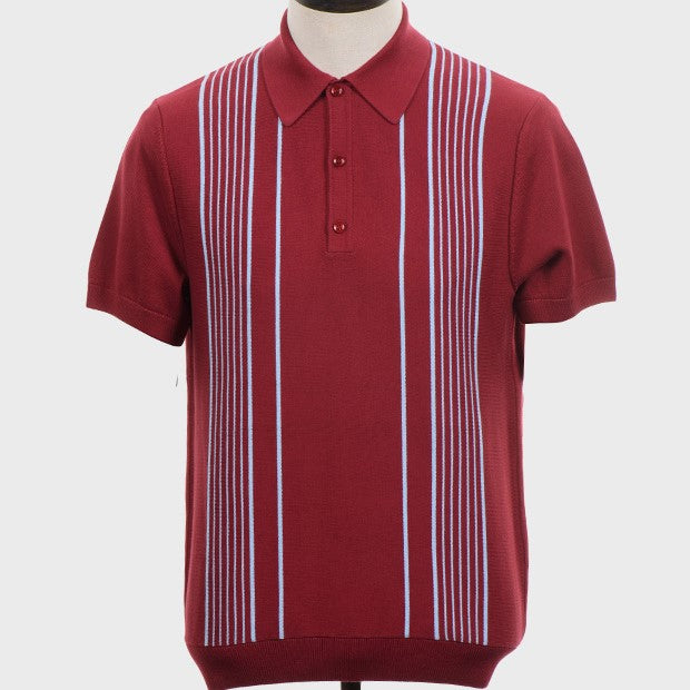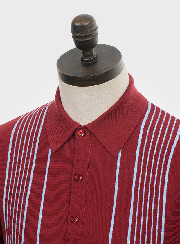 Wine, short sleeved, knitted polo shirt with sky blue vertical multi stripes. Fine gauge, retro style knitwear.