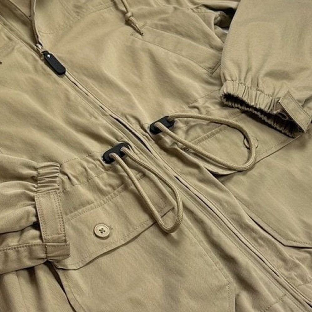 - Adjustable waist strings and adjustable cuffs, with subtle logo buttons
